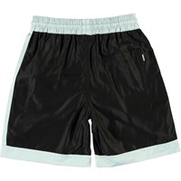 Arnold is a pair of sporty shorts in black with blue edges. They have an elastic waist with ties and 'One world' printed down one leg.