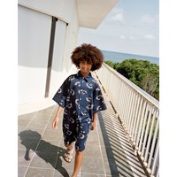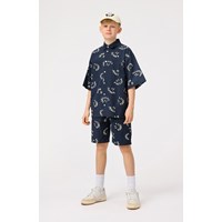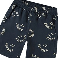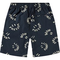 Knee-length shorts in organic cotton. The shorts have an elastic waist, pockets on the sides, a back pocket, and a loose, baggy fit. Blue with a print of smiling faces and cool statements. Pair with a matching shirt for a cool outfit.