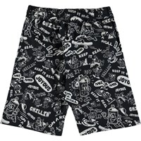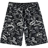 Avart is a pair of black shorts in the "Spraycans Black" print that's drawn with white lines. Avart has an elastiic waist, two front pockets and one on the back.