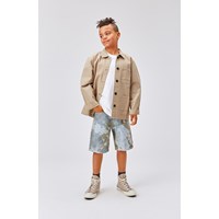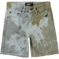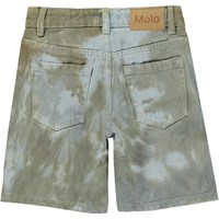 Avian is a pair of denim shorts with a tie-dye print in shades of green and blue. They have front and back pockets as well as a Molo logo leather patch. All of Molo's tie-dye prints are handmade, so each garment is unique.