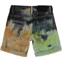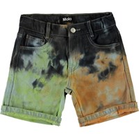 Avian is a pair of dark denim shorts in green and orange tie-dye. They have roll up at the legs. Avian is in 100% cotton.