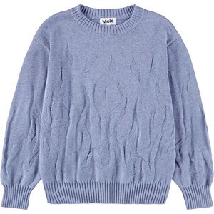 Light blue knitted sweater made of a cotton and wool blend. The sweater is knitted with a flame pattern. The sweater has a round neckline with ribbed edges, long sleeves and ribbed edges around the sleeves and waist.