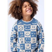 Checked knit sweater made of a cotton and wool blend. The sweater is knitted with a blue and white checkered pattern of smiling faces. The sweater has a round neckline with ribbed edges, long sleeves and ribbed edges at the sleeves and waist.