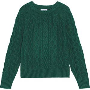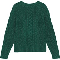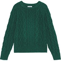 Green jumper in soft cable knit made of a wool and acrylic blend. The jumper has long sleeves, a round neckline, and ribbed edges.