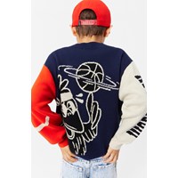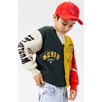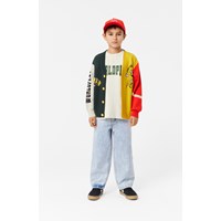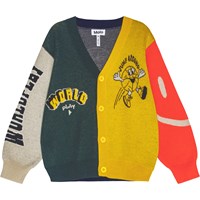 Multicoloured knit cardigan in cotton/wool with a V-neckline, buttons, ribbed placket, and ribbing at the sleeves and waist. The cardigan has a regular fit and features a college-inspired pattern, combining various elements from the "Worldplay" collection. On one sleeve and on the front, there is the text "Worldplay", while on the other sleeve, there is a big smile. On the front, there is also a happy basketball, while on the back, there is an athletic cartoon bird who is just crazy about basketball.
