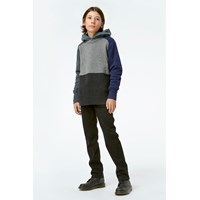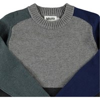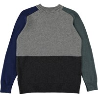Buzz is a colour-blocked knit top with two grey colours on the front and with blue and green sleeves.