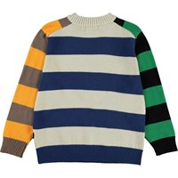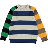 Buzzy is a knit top in a cotton mix with wide, multi-coloured stripes. Buzzy has a rib knit at the neck, wrists and waist.