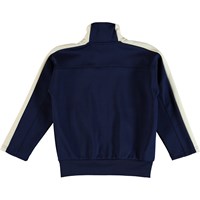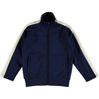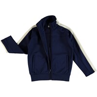 Maco is a dark blue tracksuit jacket with white stripes on the sleeves. The Maco jacket has a zip closure and pockets. Wear Maco with the matching trousers for a complete look.