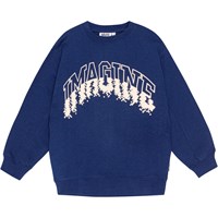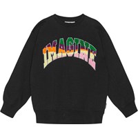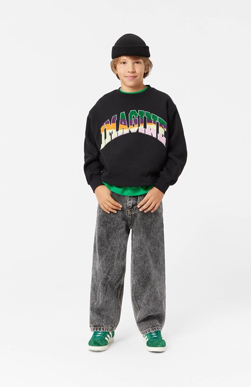 Black organic cotton sweatshirt with a brushed inner face, making it soft and warm to wear. The sweatshirt has a loose fit, long sleeves with low shoulder seams, a round neck, ribbed edges, and a multicoloured, positioned front embroidery of the text "Imagine".