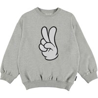 Mar is a grey sweatshirt with a print of a hand that is making a peace sign on the front.