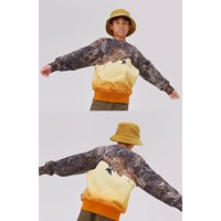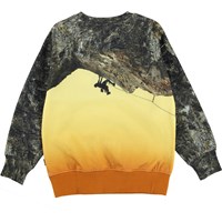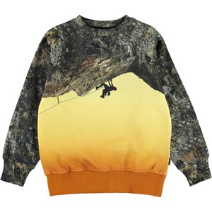 Mattis is a sweatshirt with a print of a cliff and a mountain climber on the upper part of the front and back of the sweatshirt. Under the cliff, the colour changes from yellow to orange, giving it a beautiful contrast to the sweatshirt.