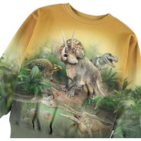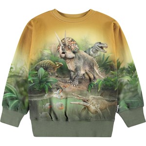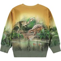 Yellow and green sweatshirt in soft organic cotton with ribbed edges at the neck, sleeves, and bottom of the sweatshirt. The sweatshirt has a regular fit with a print of dinosaurs in a wild nature.