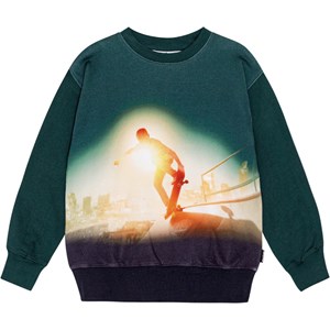 Dark green sweatshirt in organic cotton with a round neckline and ribbed cuffs and hem. The sweatshirt has a regular fit and a placement print on both the front and back, showing skaters riding a ramp. The top has a brushed inner face, making it soft and warm to wear.
