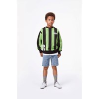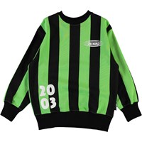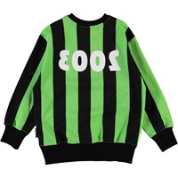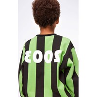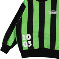 Mattis is a sweatshirt with wide, vertical green and black stripes and a white '2003' and 'One World' print. It has a black round neck and black elastic rib at the sleeves and bottom.
