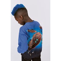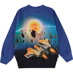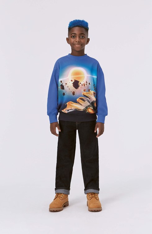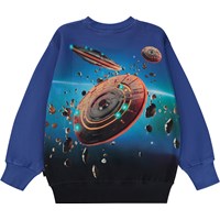 Clear blue sweatshirt with a space placement print. There are spaceships and UFO's flying around faster than the speed of light on this print. Watch out for all the dangers out there. You need to be a good pilot to navigate the asteroid belt. The print is in clear blue colours with an orange sun in the centre. This sweatshirt is constructed in 100% cotton, has a round neck with a rib edge, a rib edge at the sleeves and bottom and is in a regular fit.
