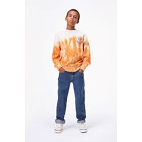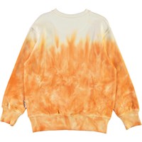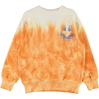 Mattis is an orange and beige tie-dye sweatshirt with a smiley face print on the chest. It has a round neck and elastic rib at the sleeves and bottom.