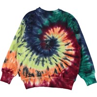 Mattis is a colourful tie-dye sweatshirt, where the colours create a spiral. The sweatshirt also has a print on the front of the past, present and future.