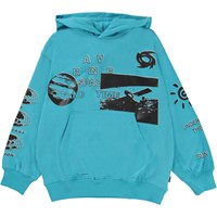 Turquoise blue hoodie with a graphic print. The print is a combo of different space inspired elements like satellites, the phases of the moon and eclipses. The print has a graphic look, with icons, texts and graphic photos, in three different tones. This hoodie is constructed in 100% cotton, has a pouch pocket, rib at the sleeves and bottom and is in an oversized fit.