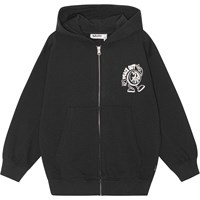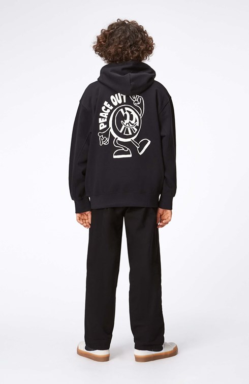 Mazz is a black hoodie, in a soft cotton/polyester quality, with a zip closure and a white placement print on the front and back. The print is in a hand drawn, cartoon character that's telling us to "Peace Out". It has a large print on the back and a small one on the front. The hoodie has a pouch pocket, a rib edge at the sleeves and bottom, and it's in a loose fit. You can wear this hoodie with the matching Allen trousers in the same colour for a perfect set.