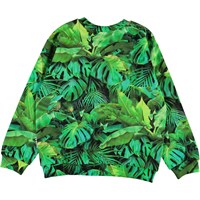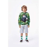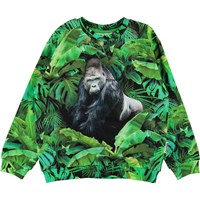 Miksi is a sweatshirt in green with a jungle and gorilla print. It has a round neck and elastic rib at the sleeves and bottom.
