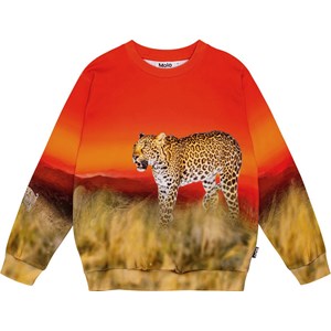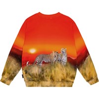 Red and orange sweatshirt in organic cotton with a round neckline, ribbed cuffs and hem. The sweatshirt has a regular fit and a brushed inner face, making it soft and warm to wear. The print features leopards on the savannah, on the lookout for dinner.