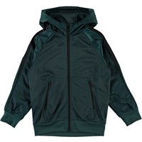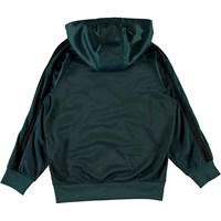 Dark green track jacket with a hood and a front zip closure. The jacket has black stripes on the sleeves and a zip pouch pocket on the front.