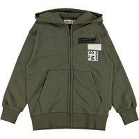 Mok is a khaki green sweatshirt with a zip closure, a hood and different Molo patches on the chest.