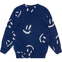 Dark blue sweatshirt in organic cotton with a brushed inner face, making it soft and warm to wear. The sweatshirt has a loose fit, a round neckline, ribbed edges, and a white all-over print consisting of many large smiles that turn and twist, creating a festive atmosphere.