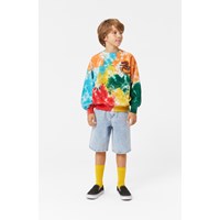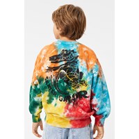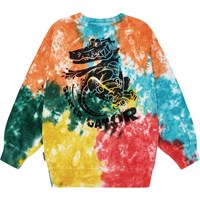 Multicoloured tie-dye sweatshirt in organic cotton with long sleeves, round neckline, and ribbed collar. The sweatshirt has a loose fit and a brushed inner face, making it soft and warm to wear. There is a placement stencil print on the front and back, featuring a black alligator on a skateboard, also known as a "Skater Gater".