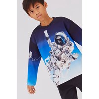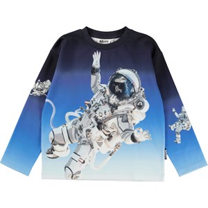 Mountoo is a long sleeve blue t-shirt with a print of flying astronauts on the front, back and sleeves.