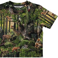 Ralphie is a t-shirt with an all-over forest print. Try to spot all the different animals of the forest in the print. The t-shirt has a round neck.