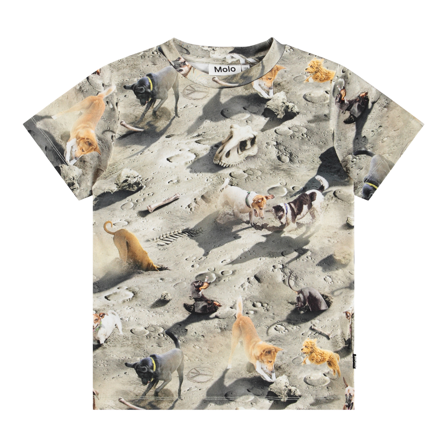 Grey T-shirt made of soft organic cotton with a ribbed neckline. The T-shirt is slim fit with a print of dogs on the moon.