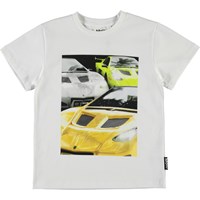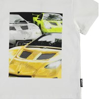 Rame is a white t-shirt with a print of cool, fast cars on the front.
