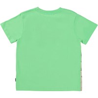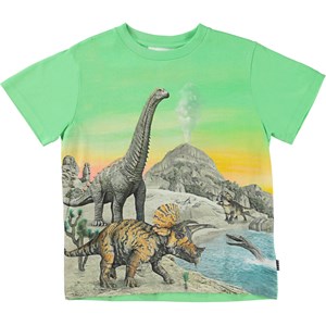 Rame, in the print 'Colourful Dinos', is a t-shirt in organic cotton with a print of a dinosauer on the front. The sky over the dinosaurs and the back of the shirt is in a strong green colour.