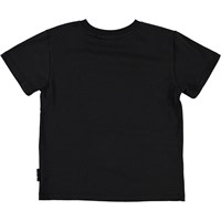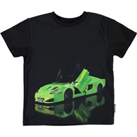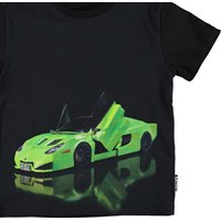 Rame is a black t-shirt with a print of a fast green car that is as shiny as its reflection.