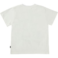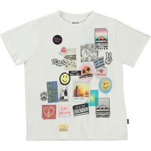 Rame is a white t-shirt with a print of various stickers from former Molo print. The t-shirt has a round neck and short sleeves.