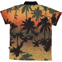 Ramon is an orange and green polo t-shirt with a print of palm trees and a graphic sunset. The t-shirt has a black collar and button closure. It is in 100% cotton.
