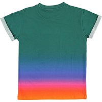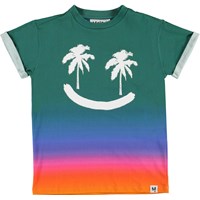 Randon is a rainbow coloured t-shirt with a print of a white palm tree smiley face and with rolled up sleeves. The t-shirt is in 100% cotton.