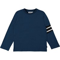 Ras is a long sleeve, blue top with white and black stripes on one sleeve.