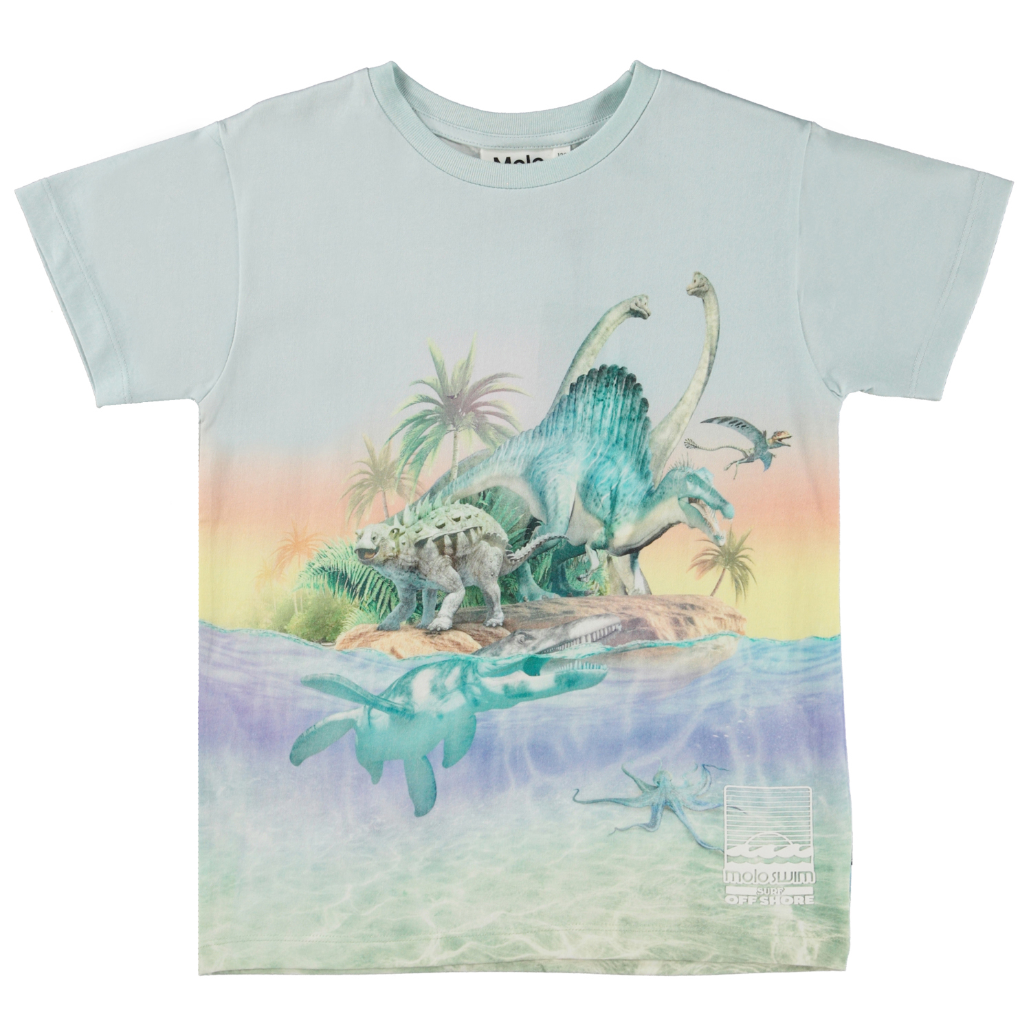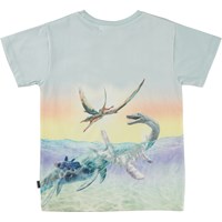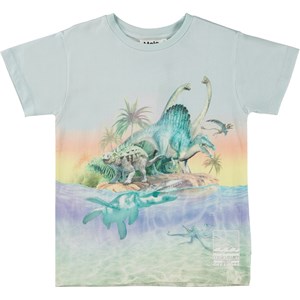 Pastel blue t-shirt in 100% organic cotton with a multi-coloured placement print on the front. The print shows a tropical island with various dinosaurs that are on land, water and in the air. The print continues onto the back of the t-shirt. The t-shirt has a round neck with a rib edge and is in a regular fit.