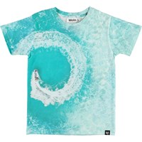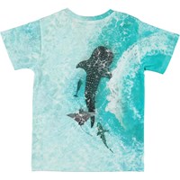 A speedboat flying by, forming a pattern on the water. On the back is one of the ocean's fantastic creatures. The t-shirt is in 100% cotton.