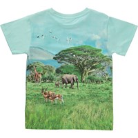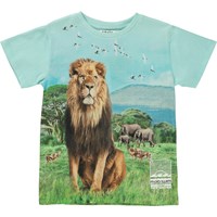 Raul is a blue t-shirt with a print of a lion and elephants. The t-shirt has short sleeves and a round neck.