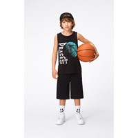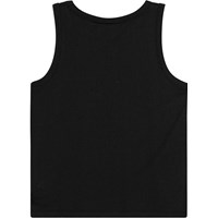 Rave is a black tank top constructed in 100% organic cotton. Rave has a round neck with a rib edge, a loose fit and a print on the front of a graphic, turquoise basketball, where the lines on the ball form a peace sign. It has a "Peace Out" message in white.