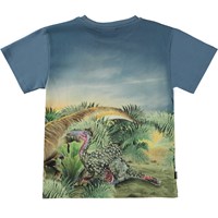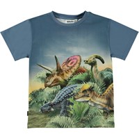 Blue t-shirt with a placement print on the front and back. The print is in bright, vivid colours and shows a group of dinosaurs that are all looking in the same direction. Maybe they've noticed something new on the sleeve? Is it a new species that may replace the dinosaurs on Earth? Maybe they can feel a new era is breathing down their necks. This t-shirt is constructed in 100% cotton, has short sleeves, a round neck with rib and is in a regular fit.
