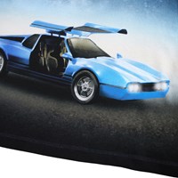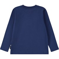 Dark blue long-sleeved top made of soft organic cotton with long sleeves and a ribbed neckline. The long-sleeved top has a loose fit with a front print of a blue sports car under a sky fullf of stars.