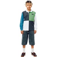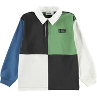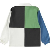 Rugby shirt made of soft, organic cotton with long sleeves and ribbed edges, white shirt collar and a small placket with three hidden buttons. The shirt has a regular fit and is divided into large squares in white, green and black, with one sleeve in blue and the other in white.