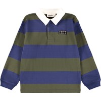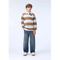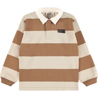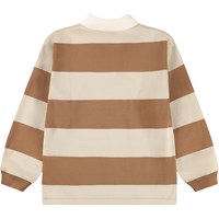Wide striped brown and beige rugby shirt made of soft organic cotton. The shirt has a regular fit, long sleeves with ribbed cuffs, a white shirt collar and a small button placket with three hidden buttons, making it easy to put on.