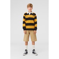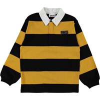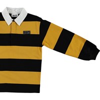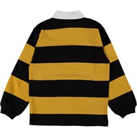 Reiz is a long sleeve polo shirt with yellow and black stripes and a white collar.