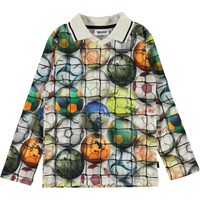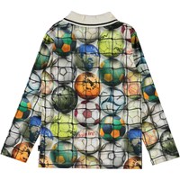 Renomi is a long sleeve polo t-shirt with a print of footballs. The polo has a white collar with a black stripe.
