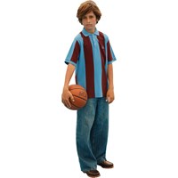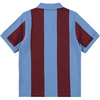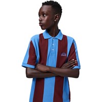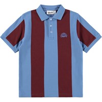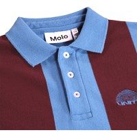 Polo shirt made of soft, organic cotton with a classic collar, button closure at the front and blue edges on the sleeves. It has a loose fit with wide, vertical stripes in blue and wine red, as well as a small chest logo with the text 'Unity'.
